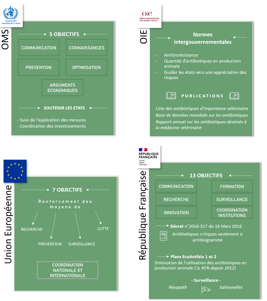 L’antibiorésistance est considérée par l’OMS comme une des plus sérieuses menace pour la santé publique, imposant ainsi une approche globale de la Santé. Des plans d’action afin de lutter contre l’antibiorésistance ont vu le jour à différentes échelles. Ils sont résumés dans l’infographie ci-dessous.